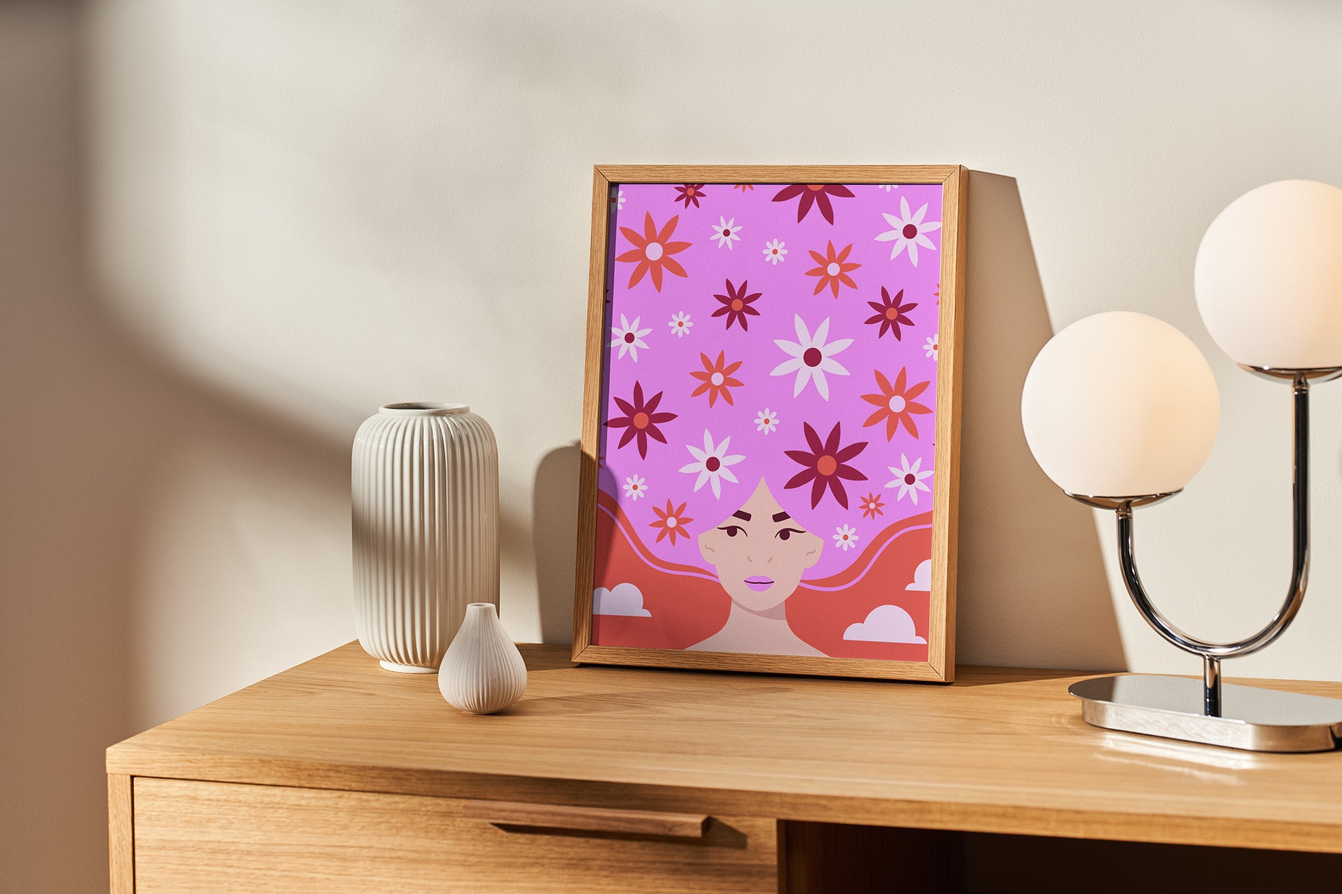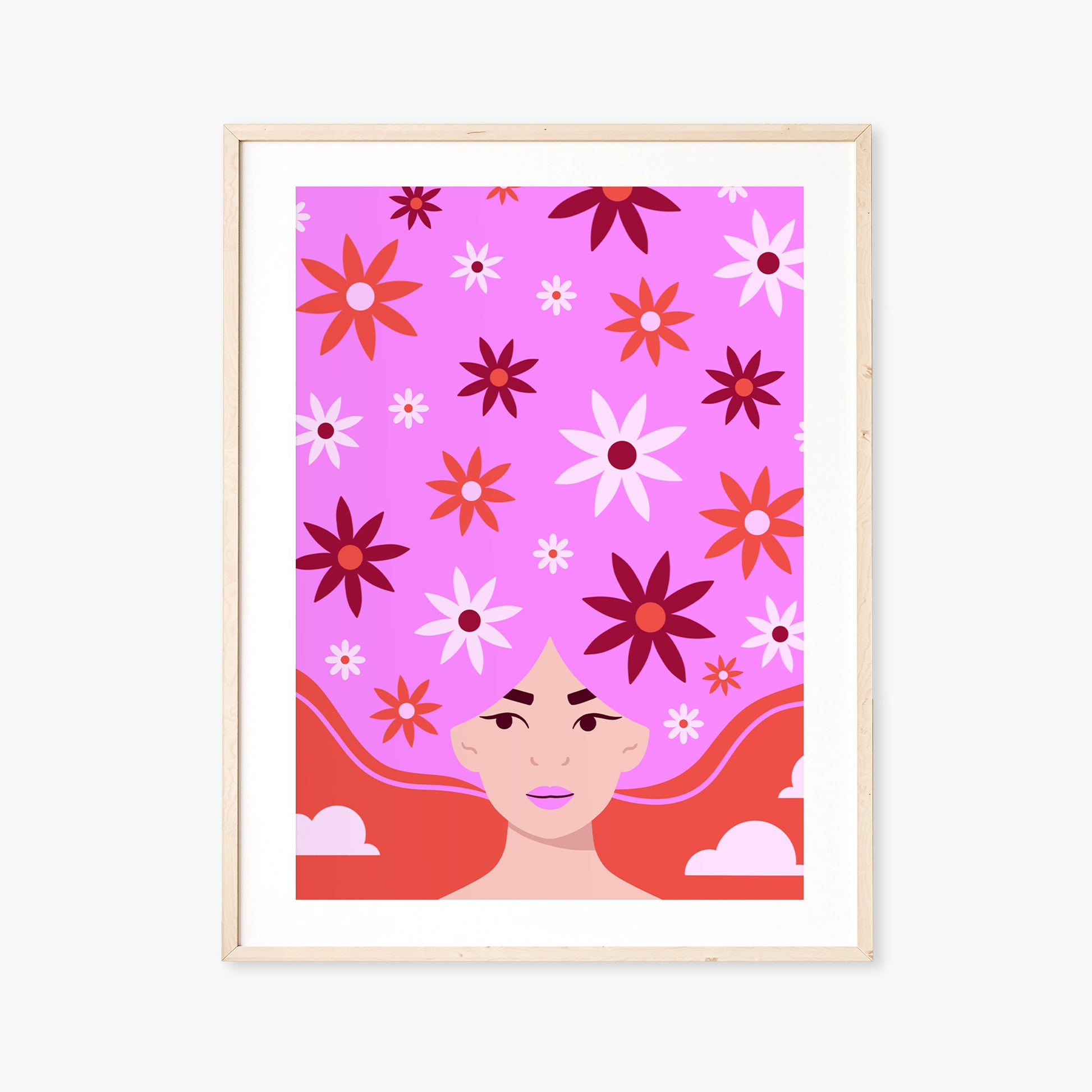 This artwork is a celebration of inner worlds: the places where imagination, growth, and self-expression quietly unfold. A serene figure emerges beneath a cascade of stylised florals, suggesting a mind alive with colour, creativity, and gentle strength.