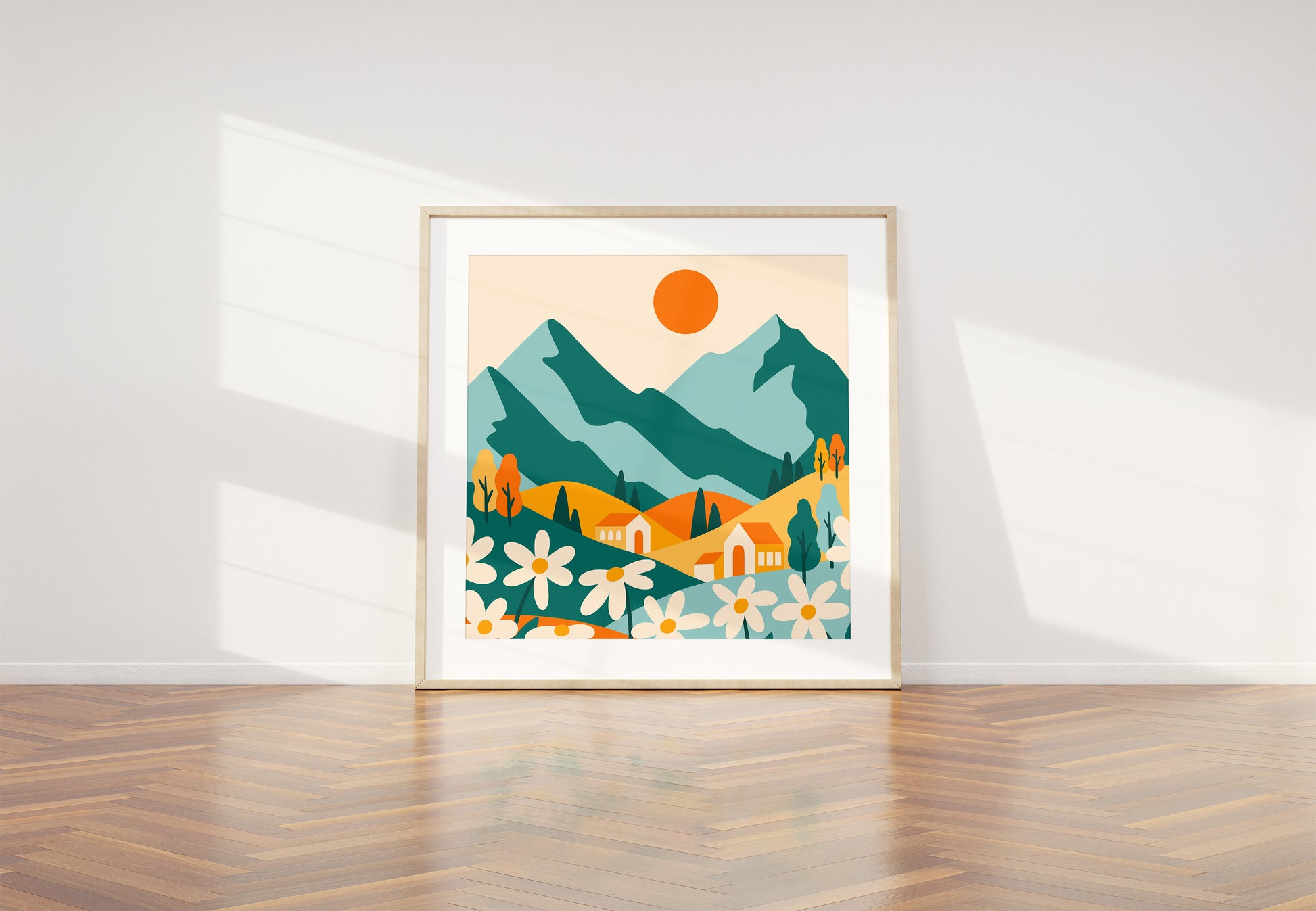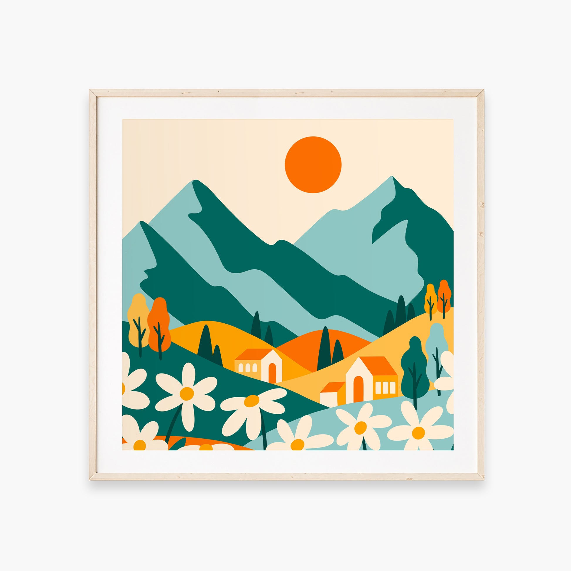 This landscape reflects the comfort of imagined places: familiar, peaceful, and just out of reach. Rolling hills, simple homes, and oversized florals are arranged in gentle layers, creating a rhythm that feels calm and grounding rather than grand.
